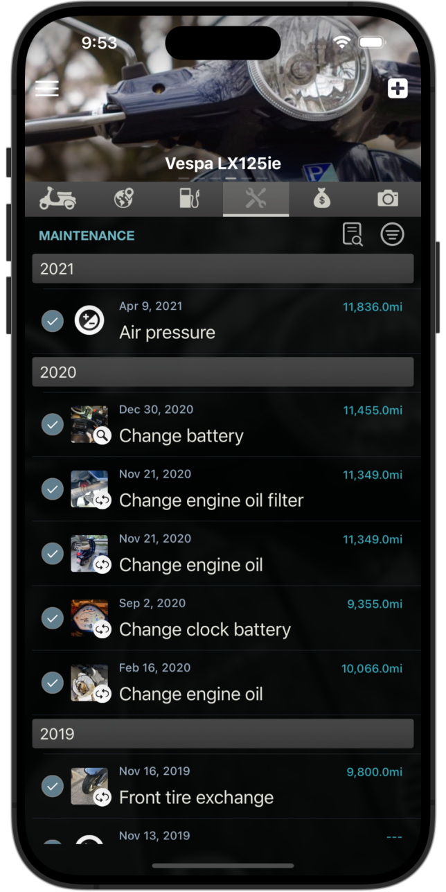 You can record the results of maintenance and work. Data is aggregated by item, allowing you to track how many kilometers or days have passed since the last operation. A reminder function is also available for the next scheduled operation.