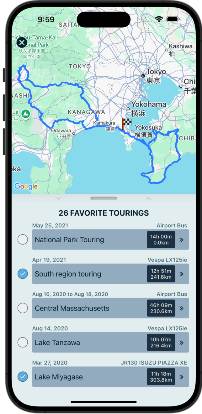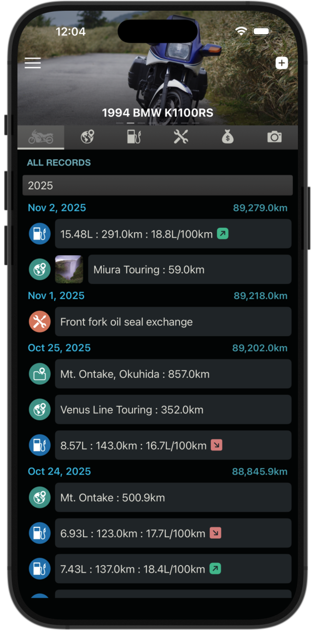 You can register expense records incurred per vehicle. Register costs such as taxes, auto insurance, and accessory purchases, and track cumulative expenses per vehicle alongside touring costs.