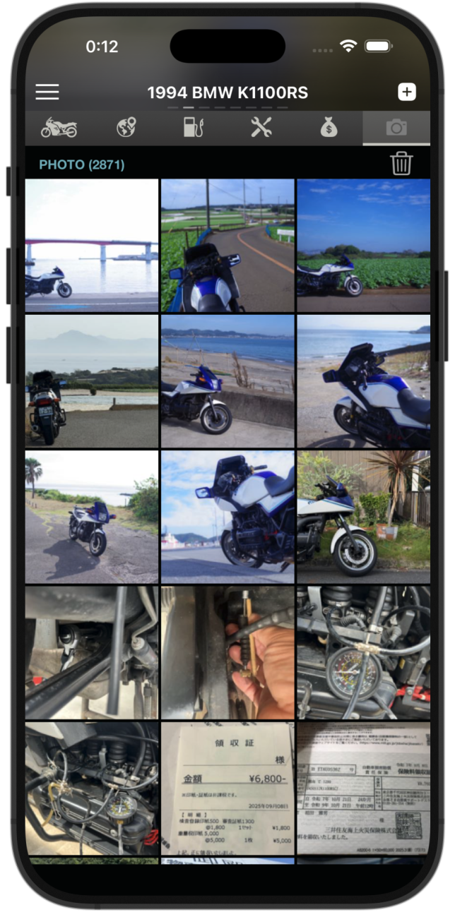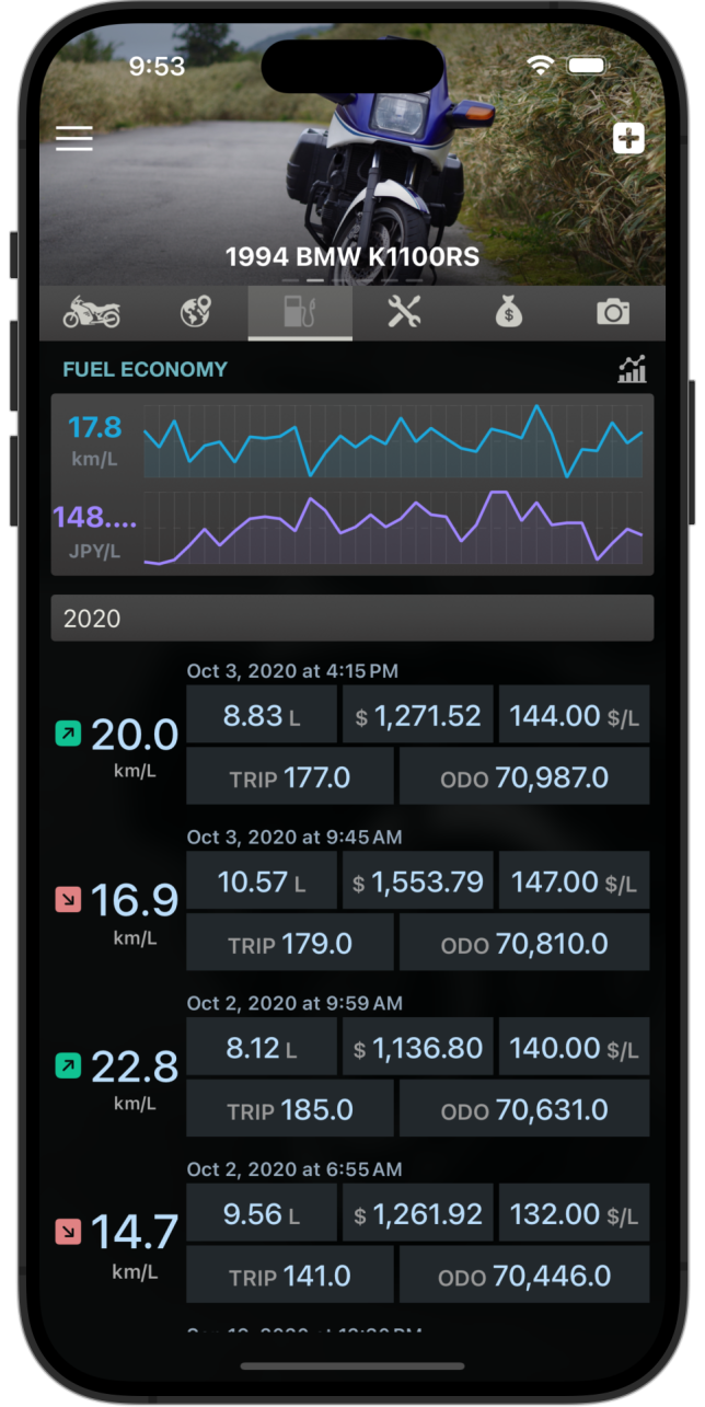 Register multiple motorcycles and cars to manage them separately. There is no limit on the number of vehicles you can register (up to 5 vehicles for the free version). You can also manage service data and cumulative expenses for registered vehicles.