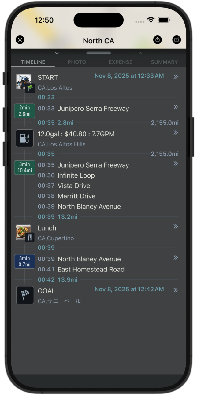 Acquires information such as actual driving time, maximum speed, and highest elevation. You can also register expenses like road tolls, food and drink costs, and lodging fees, and then aggregate the results by expense category.