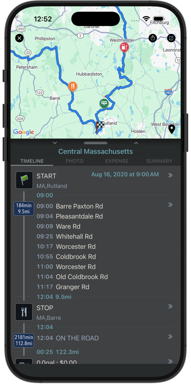 This app uses your iPhone's GPS to record driving logs. It only logs driving activity on motorcycles or cars. It does not record walking activity during stops for breaks, meals, or sightseeing.