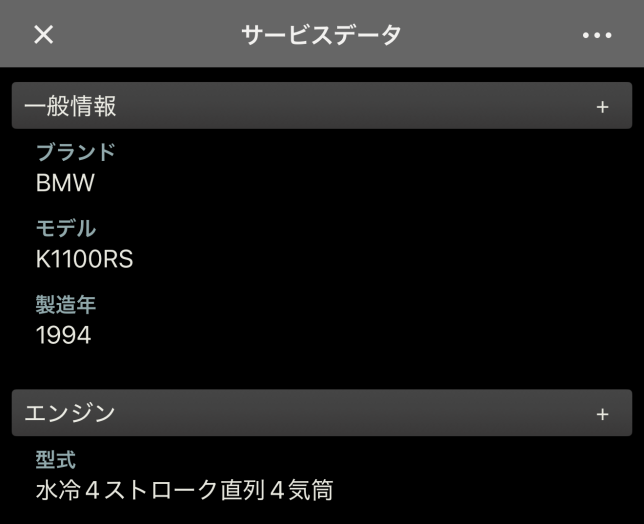 車両ごとにサービスデータを登録できます。この機能は、タイヤ空気圧や各種オイル量、締付けトルク等のメモとして使用することを意図しています。サンプルは提供していますが、これはあくまでサンプルです。貴方にとって必要な情報を自分で書き込んでください