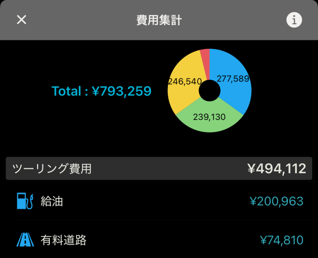 ツーリングの出費とあわせて、車両単位の出費として集計することができます