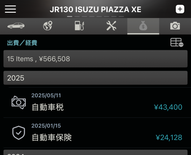 車両毎の出費情報(税金、保険、アクセサリー購入、メンテナンスとは言い難いサービスの実施など)を管理できます