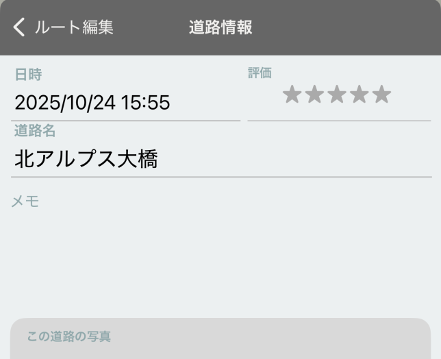 道路名は自動取得しますが、精度が良くないこと、全ての道路名を取得できるわけではないこと、そもそも通信圏外では取得できないことから、編集機能を用意しています