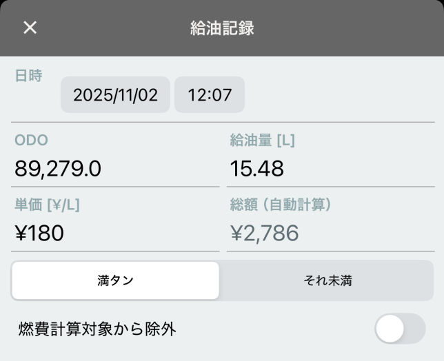 距離は基本的にGPSの値を使用しますが、オドメーター値を手入力することも可能です。手入力した場合はそちらを優先します