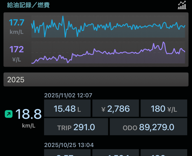 平均燃費算出、燃費推移表示、ガソリン価格推移表示などの集計機能があります
