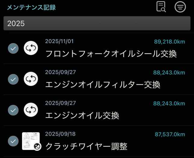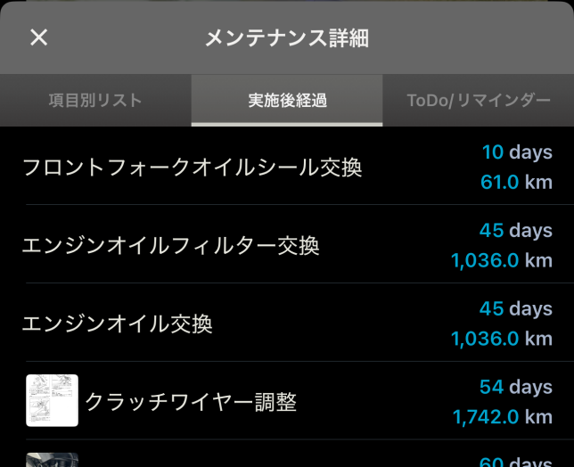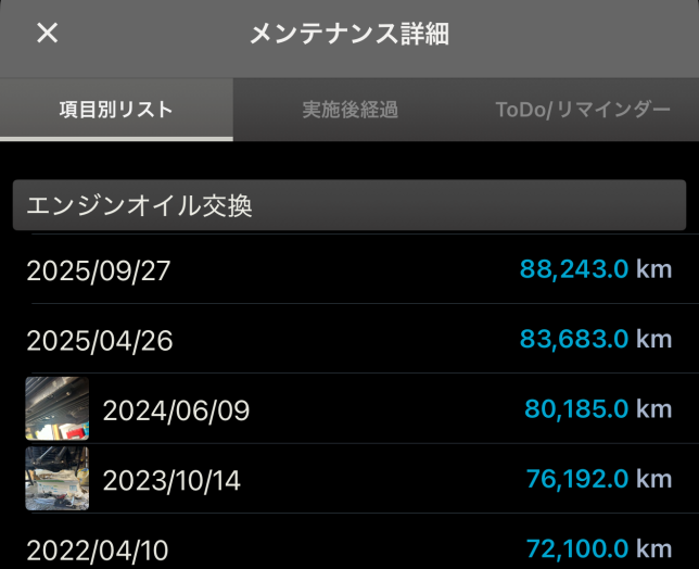 時系列リストに加え、項目単位に集約したリスト(例えばエンジンオイルフィルター交換のリスト)、前回実施から何キロ・何日経過したかを表示するリストがあります