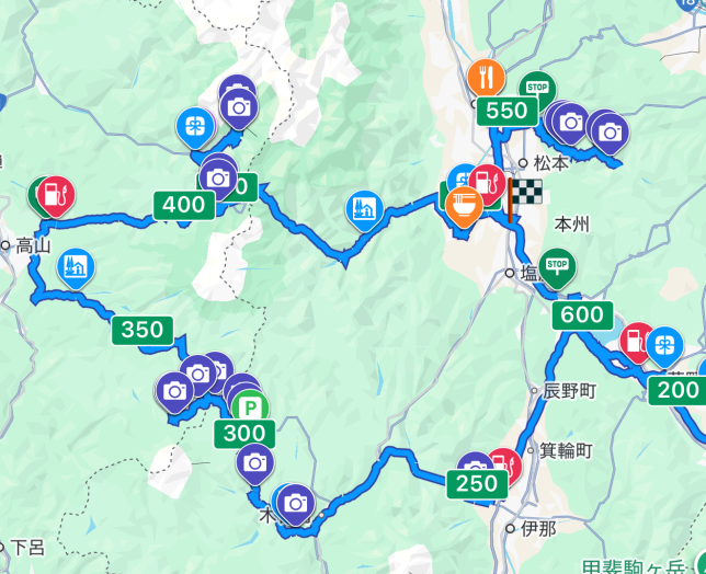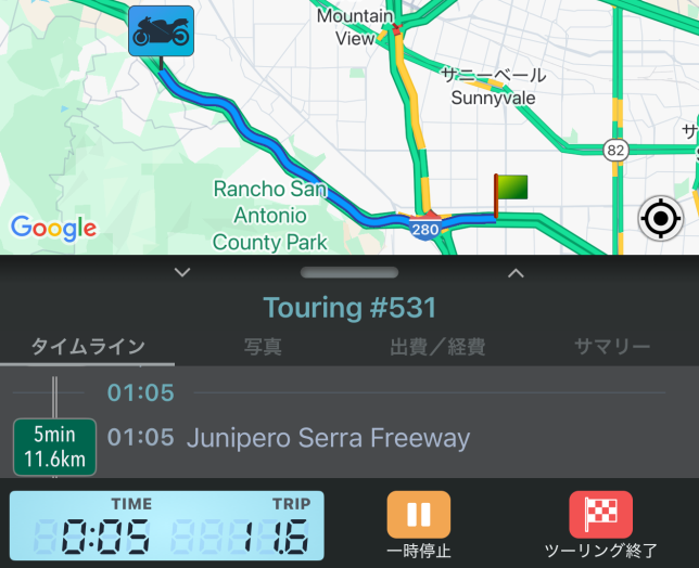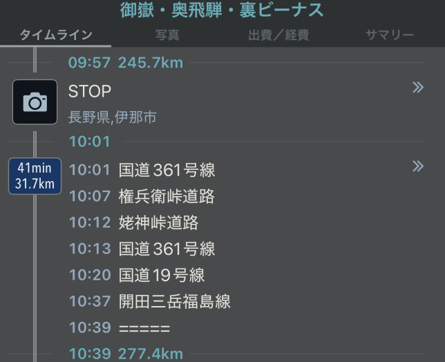 ツーリング全体の所要時間、走行時間(停止時間除外)、平均速度、最高標高、燃費、費用等をサマリー情報として表示します