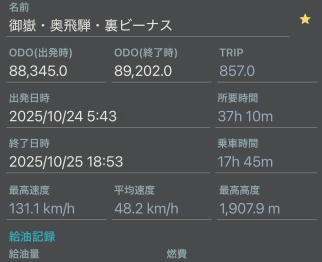 スタート・ゴールのODOと時間、所要時間、正味乗車時間(所要時間から停止時間を引いたもの)、最高速度、平均速度、最高標高地点、燃費(2回以上給油した場合)、経費(登録した場合)などを表示します